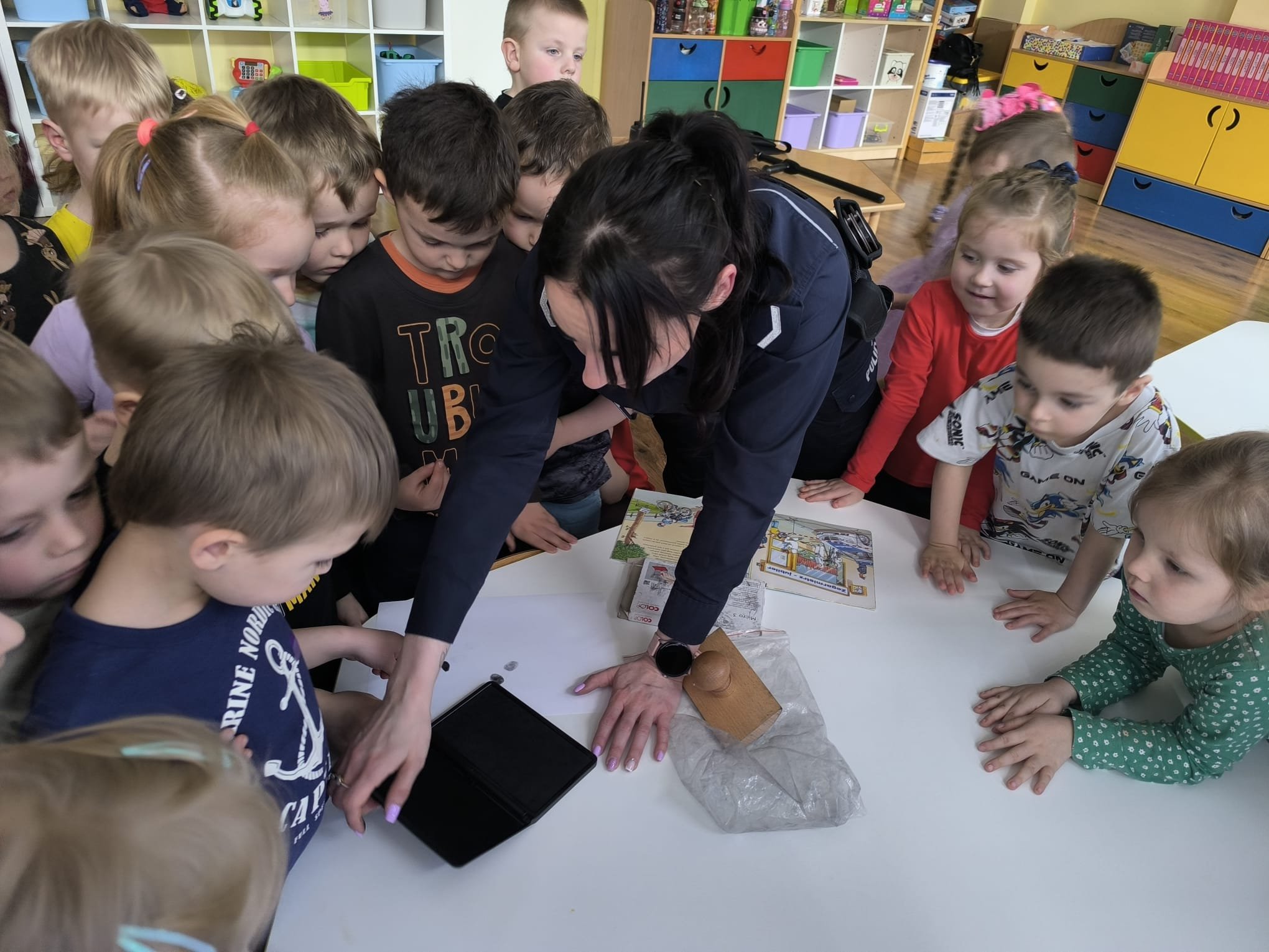 Podczas wizyty dzieci mogły dowiedzieć się, na czym polega codzienna służba policjantów oraz jakie zadania wykonują funkcjonariusze dbający o bezpieczeństwo mieszkańców. Policjantka opowiedziała również o elementach wyposażenia, które są niezbędne w pracy mundurowych.