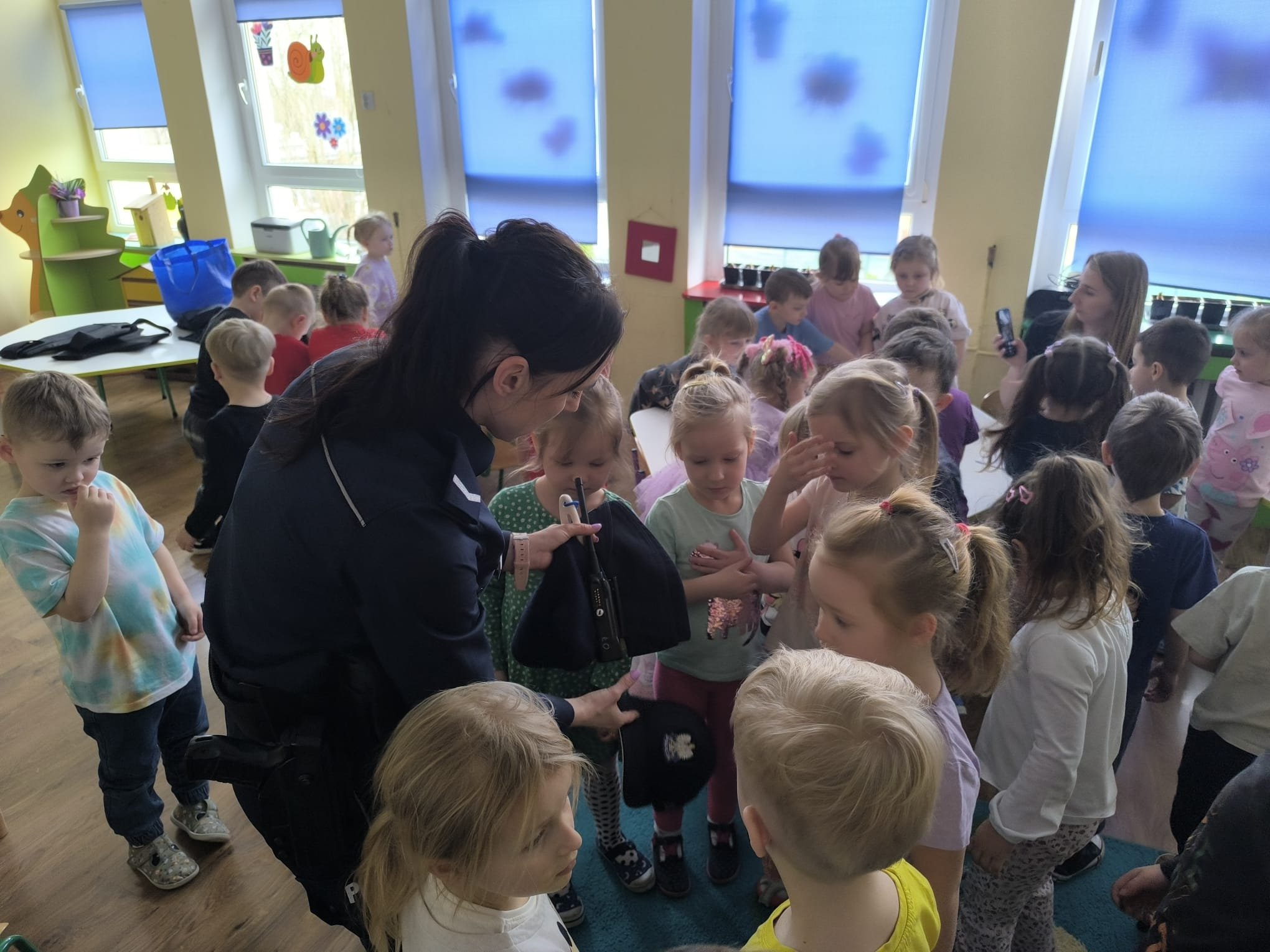 Podczas wizyty dzieci mogły dowiedzieć się, na czym polega codzienna służba policjantów oraz jakie zadania wykonują funkcjonariusze dbający o bezpieczeństwo mieszkańców. Policjantka opowiedziała również o elementach wyposażenia, które są niezbędne w pracy mundurowych.