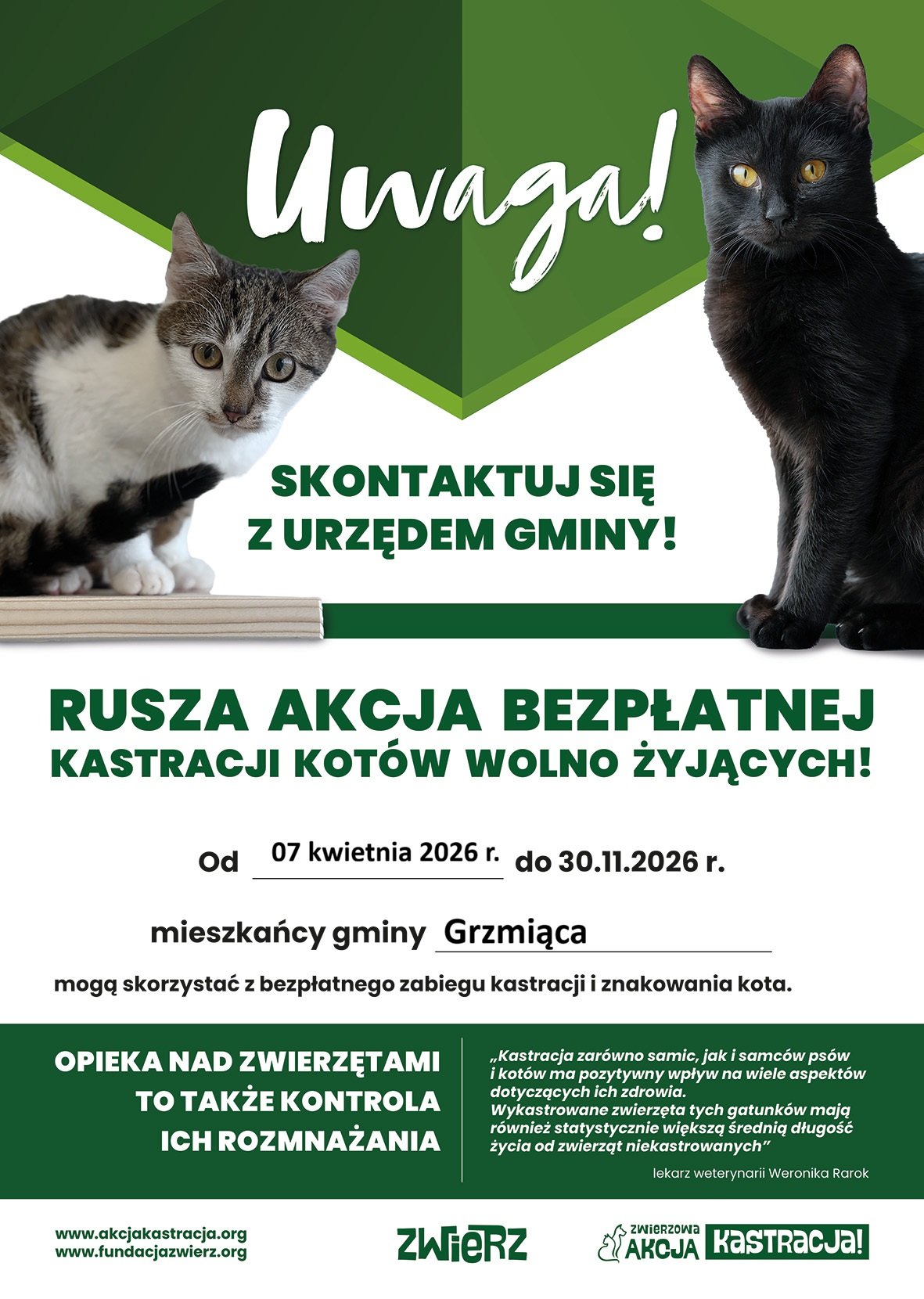 ZWIERZowa Akcja Kastracja 2026 w gminie Grzmiąca – bezpłatna kastracja i chipowanie zwierząt